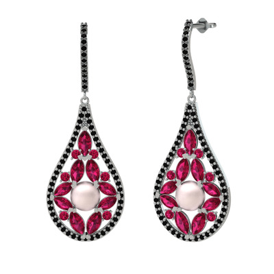 Pembe inci, rodolit garnet ve siyah zirkon 8 ayar beyaz altın küpe