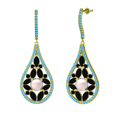 Pembe inci, siyah zirkon ve akuamarin 18 ayar altın küpe