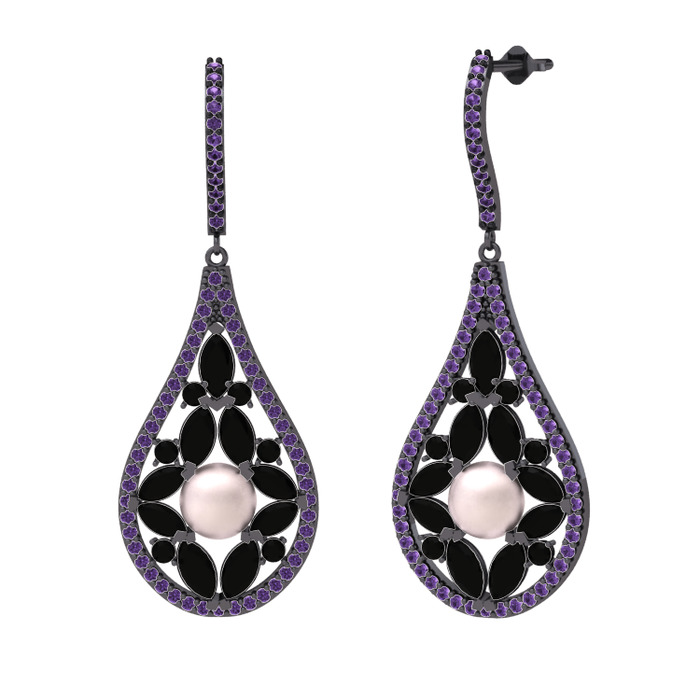 Pembe inci, siyah zirkon ve ametist 925 ayar siyah rodyum kaplama gümüş küpe