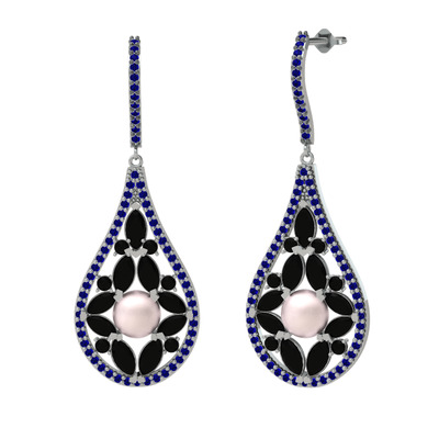 Pembe inci, siyah zirkon ve lab safir 8 ayar beyaz altın küpe
