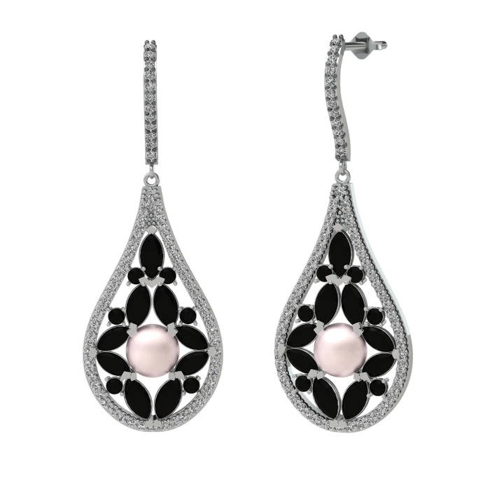 Pembe inci, siyah zirkon ve swarovski 18 ayar beyaz altın küpe