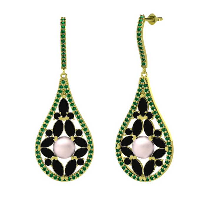 Pembe inci, siyah zirkon ve yeşil kuvars 925 ayar altın kaplama gümüş küpe