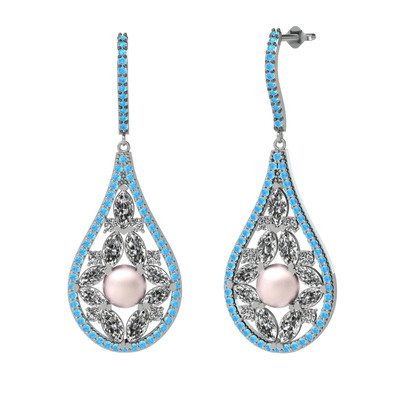 Pembe inci, swarovski ve akuamarin 14 ayar beyaz altın küpe