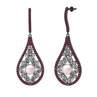 Pembe inci, swarovski ve kök yakut 925 ayar siyah rodyum kaplama gümüş küpe