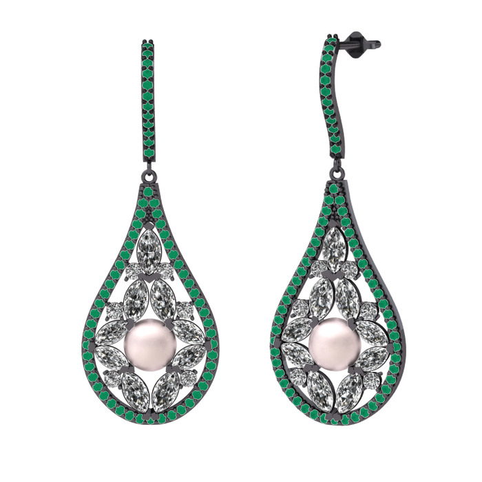 Pembe inci, swarovski ve kök zümrüt 925 ayar siyah rodyum kaplama gümüş küpe