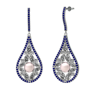 Pembe inci, swarovski ve lab safir 8 ayar beyaz altın küpe