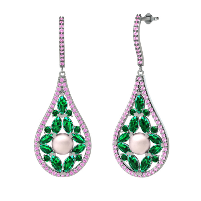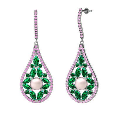 Pembe inci, yeşil kuvars ve pembe kuvars 14 ayar beyaz altın küpe