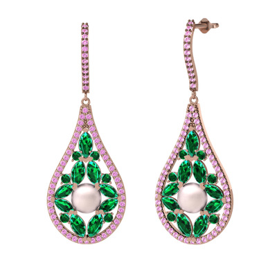 Pembe inci, yeşil kuvars ve pembe kuvars 14 ayar rose altın küpe