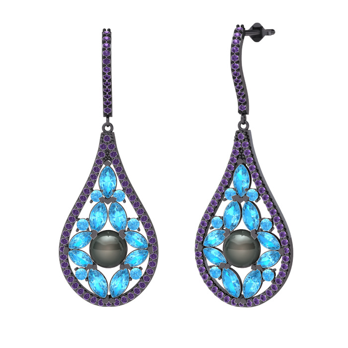 Siyah inci, akuamarin ve ametist 925 ayar siyah rodyum kaplama gümüş küpe