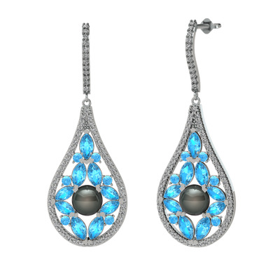 Siyah inci, akuamarin ve beyaz zirkon 925 ayar gümüş küpe