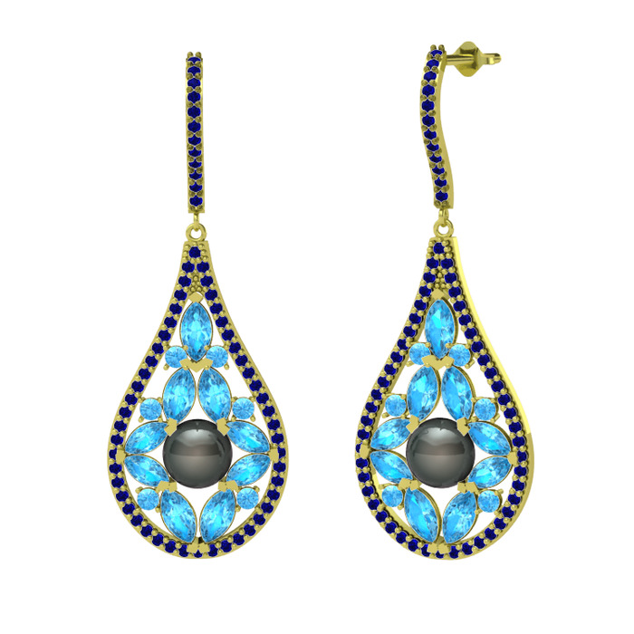 Siyah inci, akuamarin ve lab safir 14 ayar altın küpe