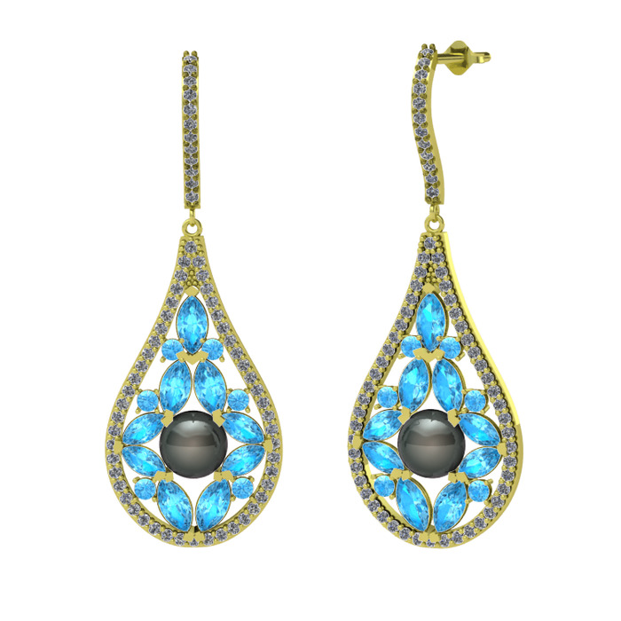 Siyah inci, akuamarin ve pırlanta 8 ayar altın küpe (1.11 karat)