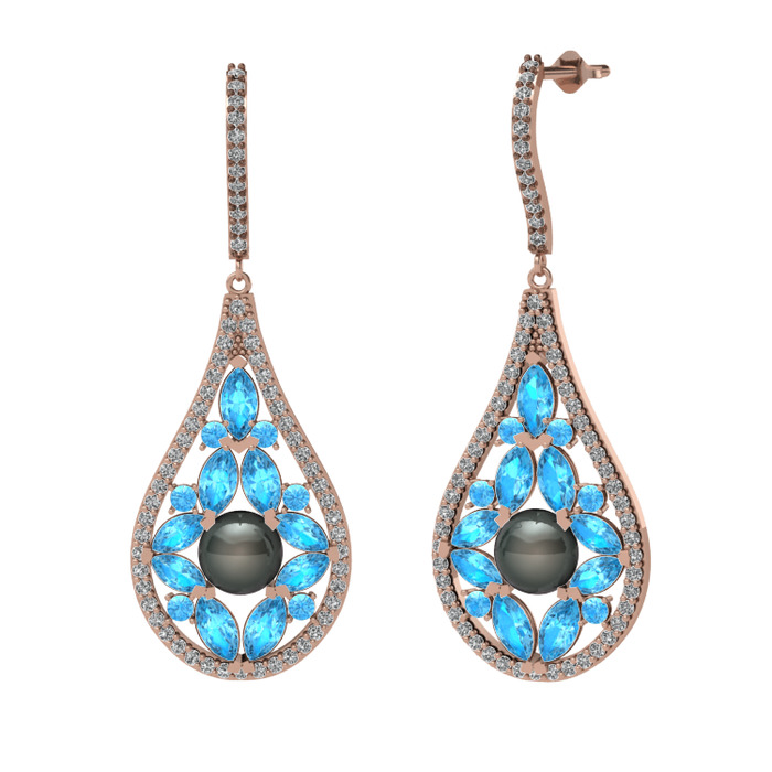 Siyah inci, akuamarin ve swarovski 14 ayar rose altın küpe