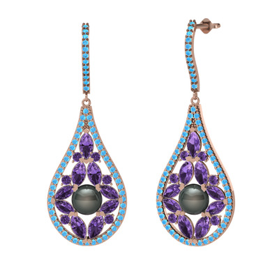 Siyah inci, ametist ve akuamarin 18 ayar rose altın küpe