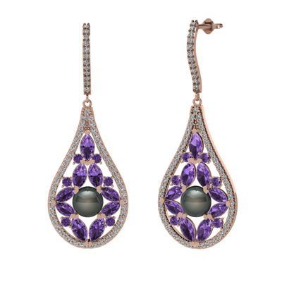 Siyah inci, ametist ve beyaz zirkon 925 ayar rose altın kaplama gümüş küpe