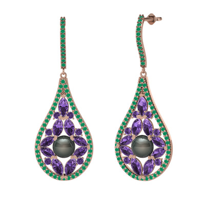 Siyah inci, ametist ve kök zümrüt 14 ayar rose altın küpe