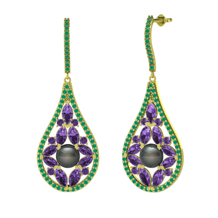 Siyah inci, ametist ve kök zümrüt 8 ayar altın küpe