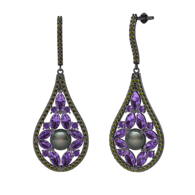 Siyah inci, ametist ve peridot 925 ayar siyah rodyum kaplama gümüş küpe