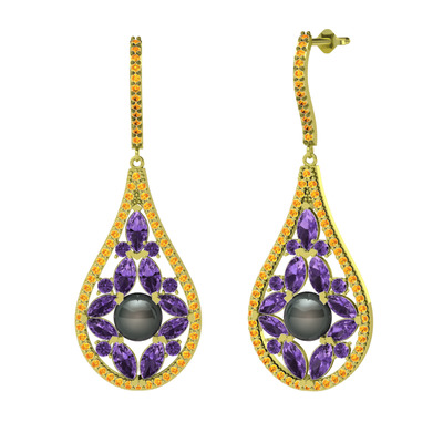 Siyah inci, ametist ve sitrin 14 ayar altın küpe