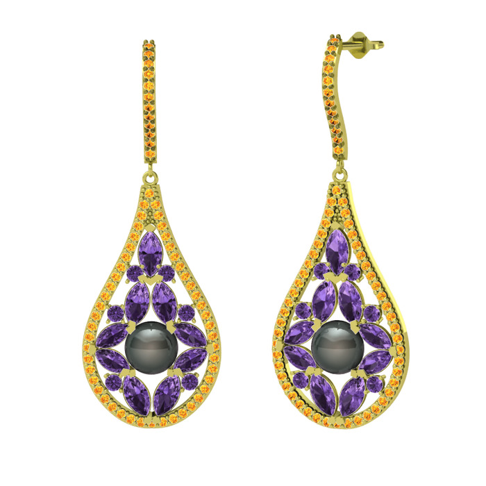 Siyah inci, ametist ve sitrin 8 ayar altın küpe