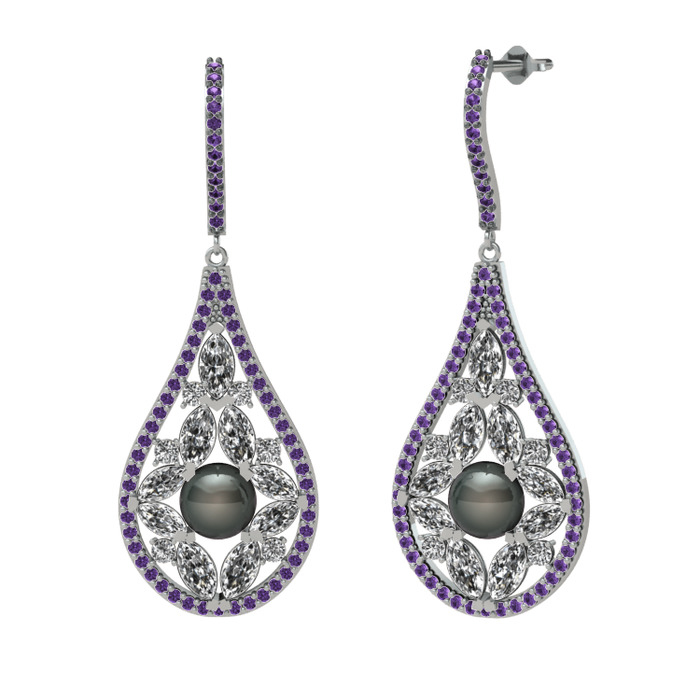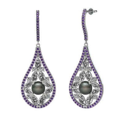 Siyah inci, beyaz zirkon ve ametist 14 ayar beyaz altın küpe