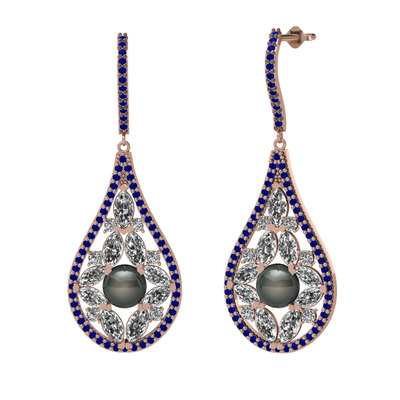 Siyah inci, beyaz zirkon ve lab safir 925 ayar rose altın kaplama gümüş küpe