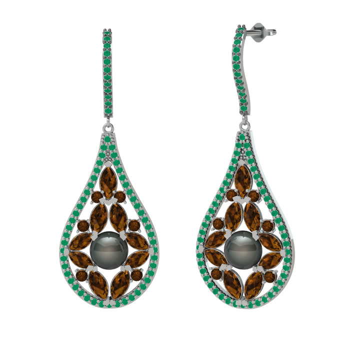 Siyah inci, dumanlı kuvars ve kök zümrüt 14 ayar beyaz altın küpe