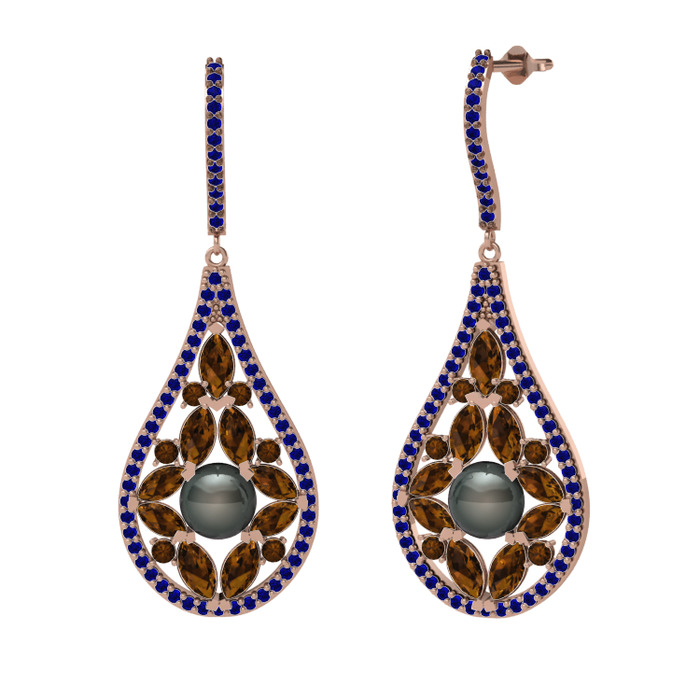 Siyah inci, dumanlı kuvars ve lab safir 8 ayar rose altın küpe