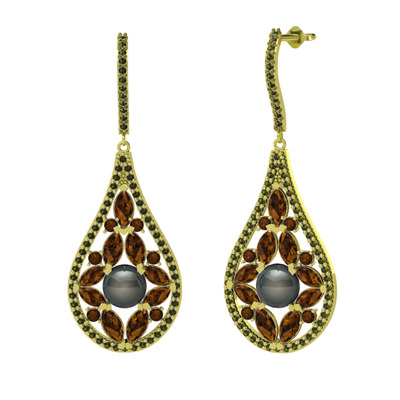 Siyah inci, dumanlı kuvars ve peridot 8 ayar altın küpe
