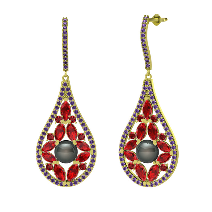 Siyah inci, garnet ve ametist 14 ayar altın küpe