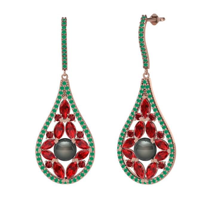 Siyah inci, garnet ve kök zümrüt 18 ayar rose altın küpe