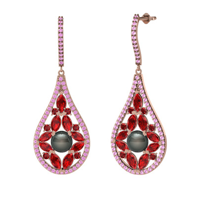 Siyah inci, garnet ve pembe kuvars 14 ayar rose altın küpe