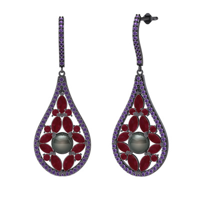 Siyah inci, kök yakut ve ametist 925 ayar siyah rodyum kaplama gümüş küpe