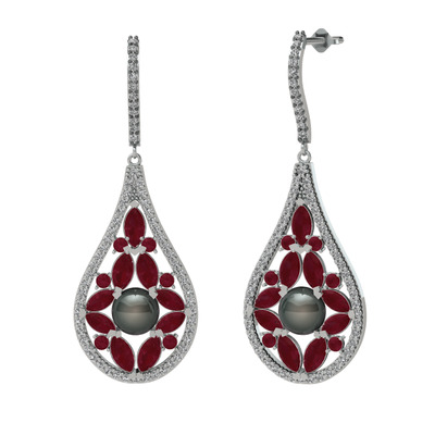 Siyah inci, kök yakut ve beyaz zirkon 925 ayar gümüş küpe