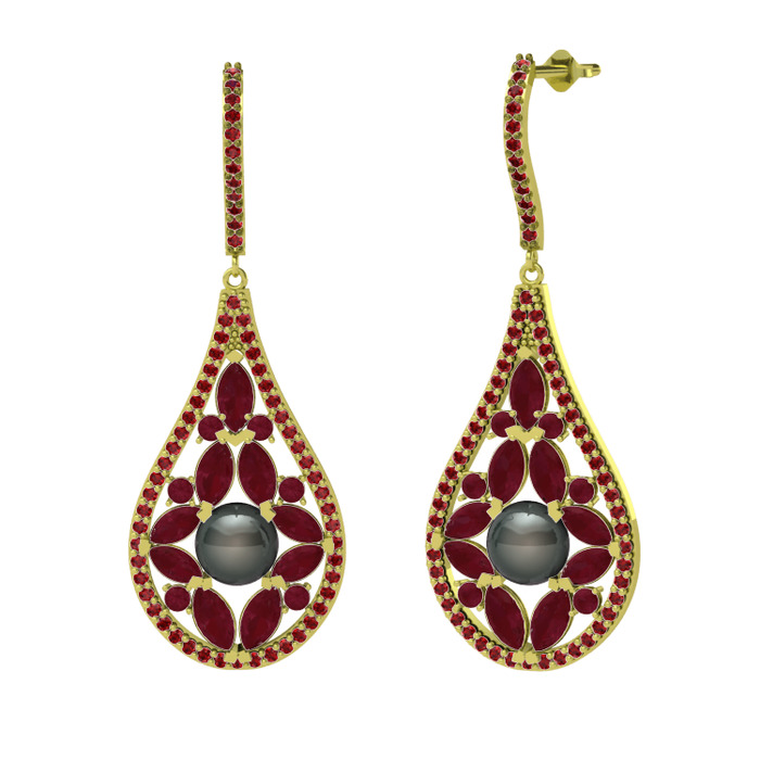 Siyah inci, kök yakut ve garnet 18 ayar altın küpe