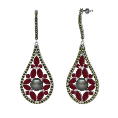 Siyah inci, kök yakut ve peridot 8 ayar beyaz altın küpe