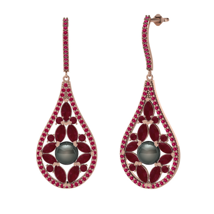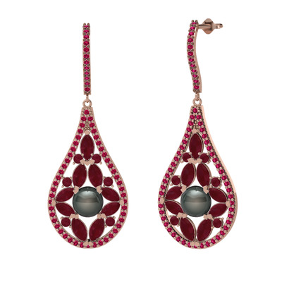Siyah inci, kök yakut ve rodolit garnet 14 ayar rose altın küpe