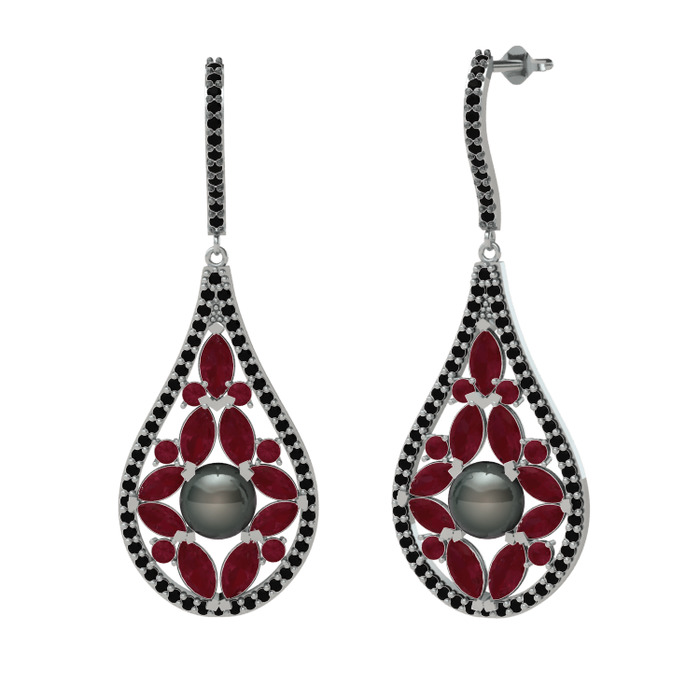 Siyah inci, kök yakut ve siyah zirkon 18 ayar beyaz altın küpe