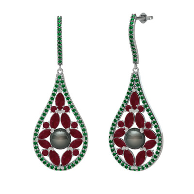 Siyah inci, kök yakut ve yeşil kuvars 18 ayar beyaz altın küpe
