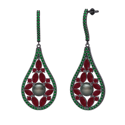Siyah inci, kök yakut ve yeşil kuvars 925 ayar siyah rodyum kaplama gümüş küpe