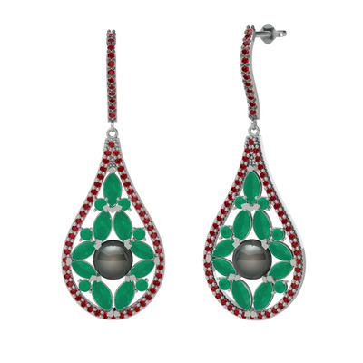 Siyah inci, kök zümrüt ve garnet 14 ayar beyaz altın küpe