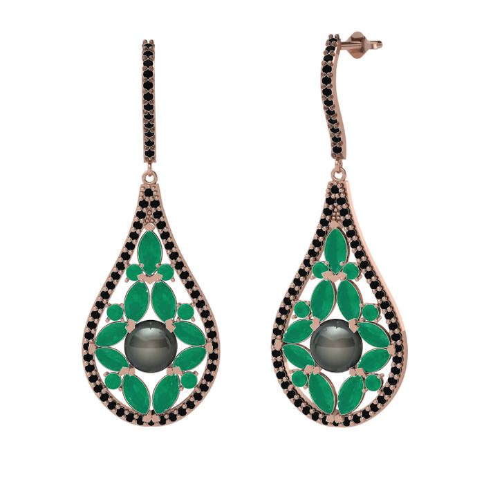 Siyah inci, kök zümrüt ve siyah zirkon 18 ayar rose altın küpe