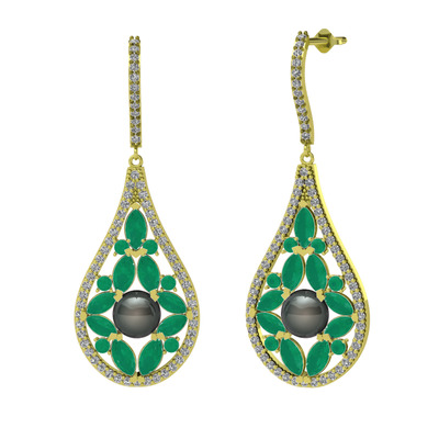 Siyah inci, kök zümrüt ve swarovski 18 ayar altın küpe