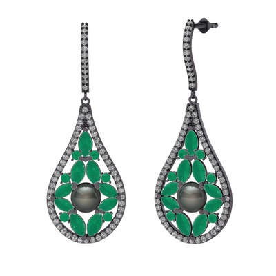 Siyah inci, kök zümrüt ve swarovski 925 ayar siyah rodyum kaplama gümüş küpe