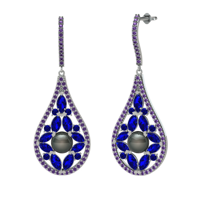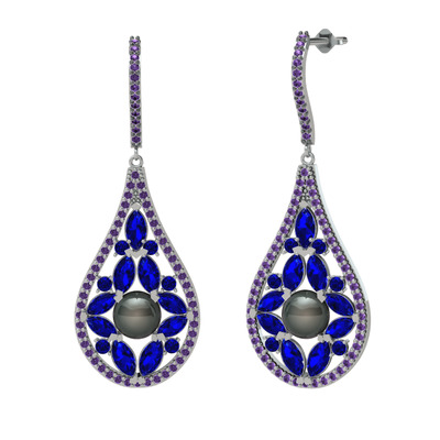 Siyah inci, lab safir ve ametist 8 ayar beyaz altın küpe