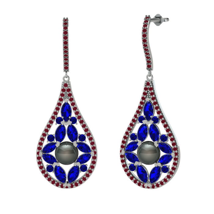 Siyah inci, lab safir ve kök yakut 14 ayar beyaz altın küpe