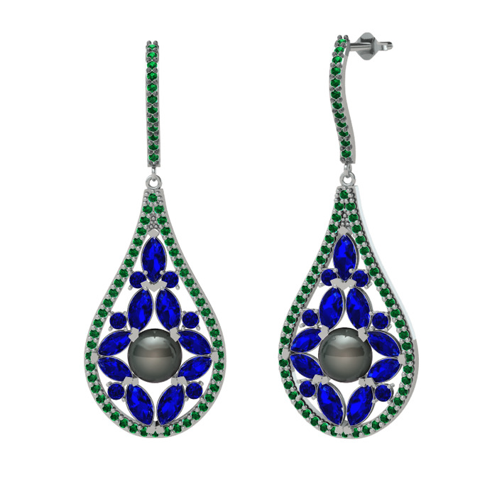 Siyah inci, lab safir ve yeşil kuvars 925 ayar gümüş küpe