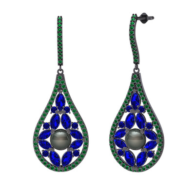 Siyah inci, lab safir ve yeşil kuvars 925 ayar siyah rodyum kaplama gümüş küpe