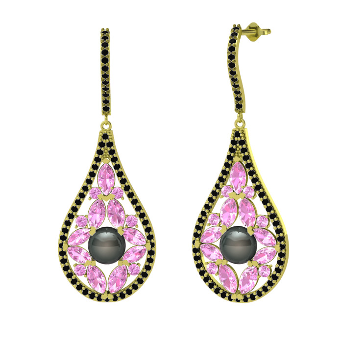 Siyah inci, pembe kuvars ve siyah zirkon 14 ayar altın küpe