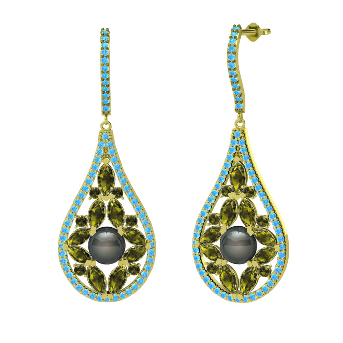 Siyah inci, peridot ve akuamarin 8 ayar altın küpe